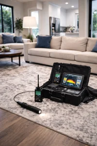 • 📡 Verificari NLJD: scanari ale mobilierului, prizelor, corpurilor de iluminat; multe jonctiuni nenaturale apar ca raspuns puternic armonic de ordin 2/3 la 2,4 GHz.